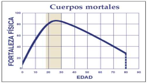 ¿En dónde se ubican ustedes en la gráfica? Todos ustedes están cerca o acercándose al punto más alto. Ya que la mayoría de los presentes esta noche tienen menos de 30 años, fíjense que sólo han experimentado aumento en la fuerza física. En su mayor parte, ustedes sólo saben lo que significa hacerse cada vez más fuertes; pero en unos años notarán la diferencia. No pasarán muchos años antes que todos ustedes hayan pasado la cúspide y comenzará el descenso. ¿Cómo será entonces?