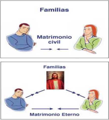 En el siguiente grupo de gráficas se ilustran las diferencias entre el no casarse, el matrimonio civil y el matrimonio por el tiempo y la eternidad. La primera cifra ilustra la relación entre un hombre y una mujer donde no existe un contrato. Las dos personas viven juntas pero se distancian. Las promesas que se comparten son limitadas y no existe un enlace formal entre ellos. Su meta parece que no es más que la satisfacción personal. Ya que no existe un contrato, los hijos que nacen en estas circunstancias tienen poca seguridad. La relación es frágil y casi siempre es breve.