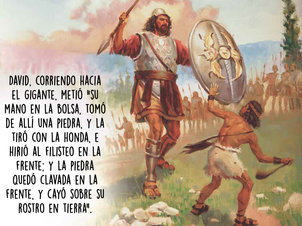 Enfurecido, Goliat fue hacia él. David, corriendo hacia el gigante, metió “su mano en la bolsa, tomó de allí una piedra, y la tiró con la honda, e hirió al filisteo en la frente; y la piedra quedó clavada en la frente, y cayó sobre su rostro en tierra” (1 Samuel 17:49).