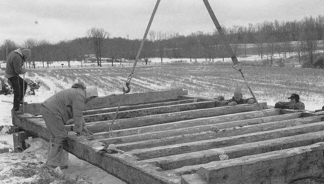 Los troncos, de los bosques que rodean la granja de los Smith, se cortaron en febrero de 1997 y luego, durante el año, el constructor los hizo formar a mano con hachas en Cazenovia, Nueva York. Después, los labraron con herramientas para que tuvieran dos caras planas, según las técnicas de construcción de la época.