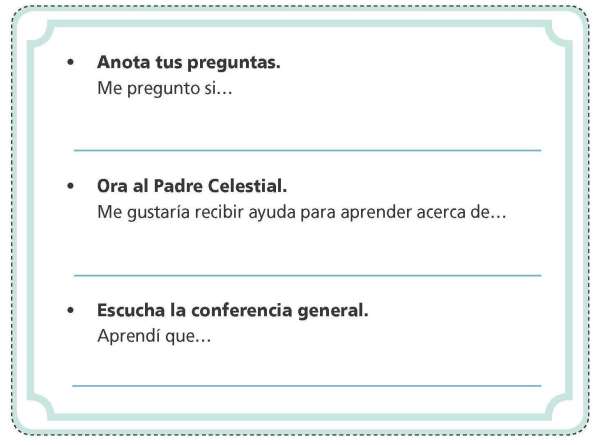 Utiliza esta tarjeta a fin de prepararte para la conferencia general; llévala contigo durante la conferencia para que puedas escribir lo que aprendas.