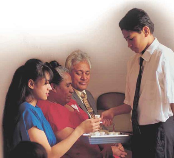 El participar de la Santa Cena es un proceso mental sagrado, y como tal se convierte en algo muy personal para mí. Yo pienso en los convenios que hago con Dios y Jesús mientras se ofrecen las oraciones; pienso en Dios, que ofreció a su Hijo Unigénito; pienso en el sacrificio expiatorio de mi Salvador, Jesucristo. La Santa Cena fue instituida por El, El ofreció su cuerpo y sangre para toda la humanidad, aun para mí, y designó el pan y el agua como emblemas simbólicos. Porque yo tengo la mano derecha, la ofrezco al tomar la Santa Cena, como juramento de que siempre recordaré Su sacrificio expiatorio, tomaré Su nombre sobre mí y lo recordaré, y guardaré los mandamientos de Dios.