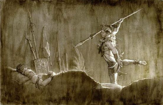 En su ira, Zerahemna cogió su espada y «corrió hacia él para matar a Moroni» (v. 12). Pero antes de que pudiera hacerlo, uno de los soldados de Moroni «rompió [su espada] y la echó por tierra, y la rompió por la empuñadura» [v. 12). A continuación, arrancó el cuero cabelludo de Zerahemna con un golpe de su espada, y «su cuero cabelludo cayó a la tierra», y envío al descabellado Zerahemna corriendo en medio de sus soldados (v. 12). Un soldado de Moroni, recogiendo el cuero cabelludo de la tierra con la punta de su espada, advirtió a los soldados de Zerahemna que si no deponían sus armas y hacían un juramento de paz «así serán echados por tierra» (v. 14). Muchos de ellos fueron golpeados por el miedo, se presentaron con las armas, y partieron para el desierto con un pacto de paz [v. 15).