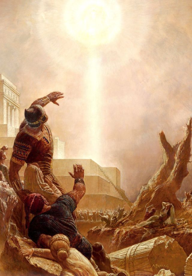— Un Templo: Los nefitas construyeron varios templos a lo largo del tiempo. Nefi construyó uno en la tierra de Nefi después de que los nefitas se separaran de los lamanitas (2 Nefi 5:16). Había otro templo en Zarahemla, desde el cual el rey Benjamín dio su sermón sobre la vida de Cristo (Mosíah 2:1, 5-6). Y finalmente, había un templo en la tierra de Abundancia, en el cual se reunieron los nefitas que sobrevivieron después de las grandes destrucciones en este continente (3 Nefi 11:1-10). Este era el templo donde se les apareció el Salvador.