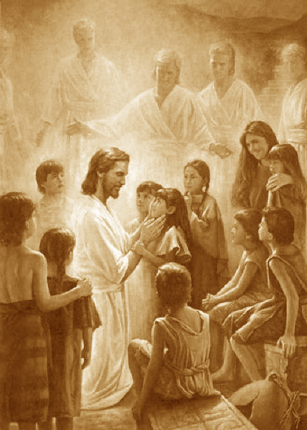 - 3 Nefi 17:21-22 Jesús bendice a los niños nefitas uno por uno. Mostrando la profundidad de su amor y compasión por los niños, a continuación, el Salvador» tomó a sus niños pequeños, uno por uno, y los bendijo, y rogó al Padre por ellos» (v. 21, véase también Mateo 19:13-15). Al parecer, estos pequeños nunca se olvidaron de este momento sagrado con su bendito Salvador, porque permanecieron fieles, al igual que a sus hijos hasta la cuarta generación, después de la partida de Jesús (Helamán 13:10, 3 Nefi 27:32 bendito).