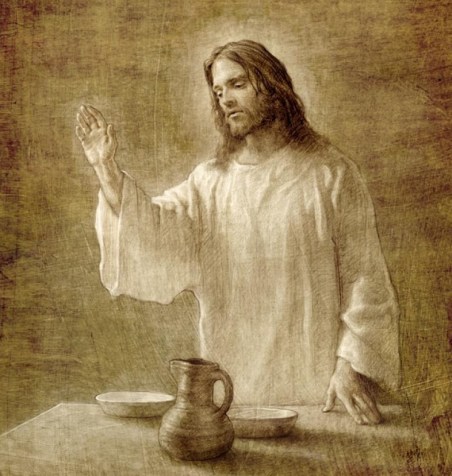 - 3 Nefi 18:1-4 Jesús instituye la Santa Cena entre los nefitas. Él ordenó a sus doce discípulos a «Traerle un poco de pan y vino» (v. 1). Entonces ordenó a la gente a «sentarse sobre la tierra» (v. 2). Tomó el pan y el vino, lo bendijo y lo dio a los doce (vv. 3, 8). Por último, El «mandó que lo dieran a la multitud» (w. 4,9).