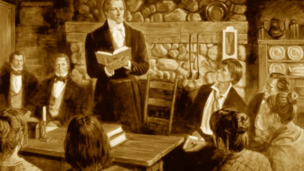| He intentado representarme en la imaginación aquel 6 de abril de 1830, la fecha en la que se organizó la Iglesia. Desde la sencilla cabaña de troncos de los Whitmer, había de comenzar a crecer en forma constante esa organización mundial en envergadura y en número, hasta llegar a tener en la actualidad millones de miembros. |
