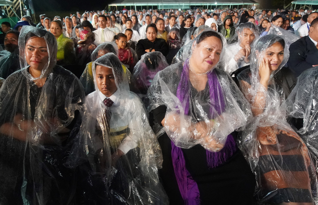 En Samoa, Fiyi y Tahití, justo cuando comenzaron las reuniones, dejó de llover; pero en Tonga, la lluvia no cesó. No obstante, 13 000 santos fieles llegaron horas antes para conseguir un asiento, esperaron pacientemente durante un aguacero constante y luego permanecieron sentados en una reunión de dos horas sumamente mojada.