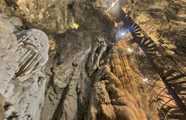 Nuestro siguiente paso de espaldas nos lanzó a una caverna estilo catedral, tan alta y ancha que podría tragarse a la Estatua de la Libertad. Allí estuvimos colgados, girando lentamente, mientras nuestros ojos se ajustaban a la relativa oscuridad. A medida que continuamos el descenso, el resplandor de las luces eléctricas iluminó una asombrosa pared de brillantes estalagmitas y estalactitas.