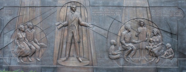 Así que la escultura muestra a José Smith en el centro, parado como en un ojo de cerradura, sosteniendo las llaves de esta dispensación. Él gesticula con su mano derecha como si enseñara a dos estudiantes actuales de BYU. Con su mano izquierda, gesticula hacia los niños que esos estudiantes de BYU esperan enseñar algún día. Y desde arriba fluyen pequeñas pero audaces líneas verticales que sugieren la gracia del cielo. Estas líneas se intersectan con líneas diagonales que sugieren la interacción entre la gracia y la enseñanza si nos enseñamos diligentemente, porque esa diligencia es la condición sobre la cual se otorga la gracia. Diligente significa cuidadoso, serio y determinado. Proviene de un término latino que significa amar o deleitarse en.