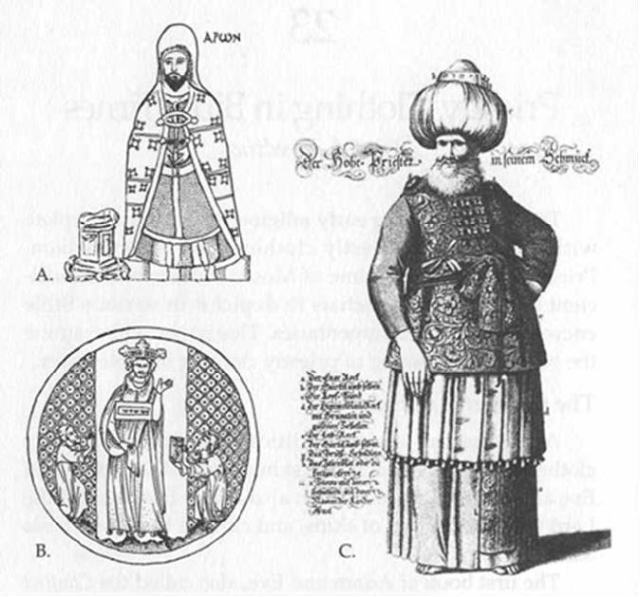 Figura 52 Las instrucciones detalladas en Éxodo 28 sobre la vestimenta del sumo sacerdote, los sacerdotes y los levitas han inspirado numerosos intentos de artistas por reconstruir su apariencia. No es sorprendente que estas representaciones reflejen más la cultura del artista que la época de Moisés. La representación más antigua del sumo sacerdote (A) se encuentra en Dura Europos (alrededor del año 245 d. C.), donde el artista no judío vistió a Aarón con túnicas reales y pantalones típicos persas. En un manuscrito hebreo del siglo XIII, este miniatura (B) muestra al sumo sacerdote llevando una corona y un pectoral con una inscripción que dice “pectoral del juicio” en lugar de las doce piedras preciosas esperadas. Finalmente, en un grabado alemán del siglo XVIII (C), el artista le da al sumo sacerdote una apariencia marcadamente barroca.
