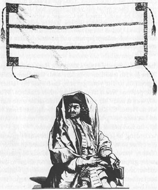 Figura 53. En esta grabado holandés de 1725, el adorador lleva el tallit sobre su sombrero de tres picos. El “chaleco de oración” tiene cuatro esquinas bordadas de las cuales cuelgan los tzitzit, consistentes en ocho hilos y cinco nudos cada uno. Lleva tefillin, o filacterias, en su mano izquierda y en la frente.