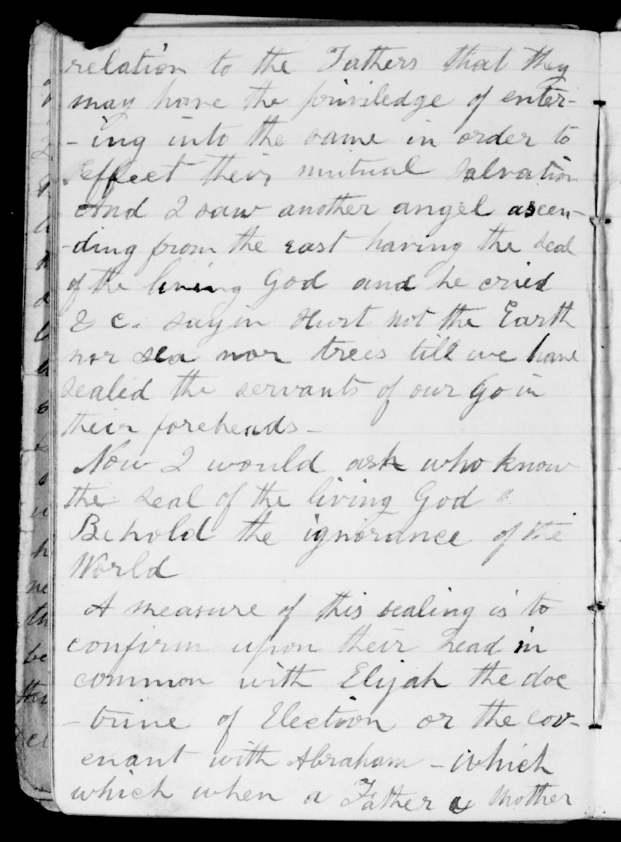 “La siguiente cita aparece en Teachings of the Prophet Joseph Smith, compilada por Joseph Fielding Smith durante su servicio como historiador y registrador de la Iglesia: ‘Cuando se pone un sello sobre el padre y la madre, asegura a su posteridad, de modo que no puedan perderse, sino que serán salvos en virtud del convenio de su padre y su madre.’”