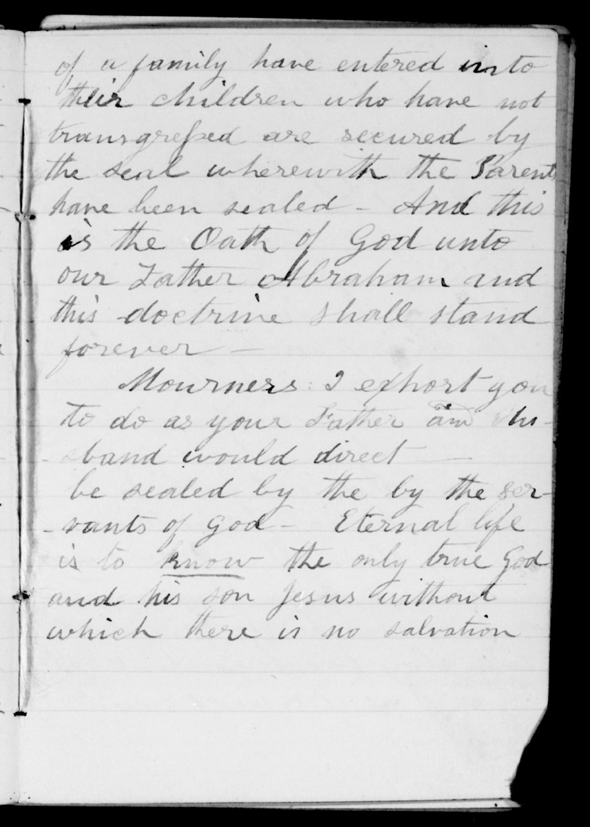“Esto es tan seguro como que el sol salió esta mañana sobre aquellas montañas. Por lo tanto, no se lamenten porque todos sus hijos e hijas no sigan el camino que ustedes les han trazado, o porque no presten atención a sus consejos. En la medida en que logremos obtener la gloria eterna, y nos mantengamos como salvadores, y como reyes y sacerdotes para nuestro Dios, salvaremos a nuestra posteridad.”