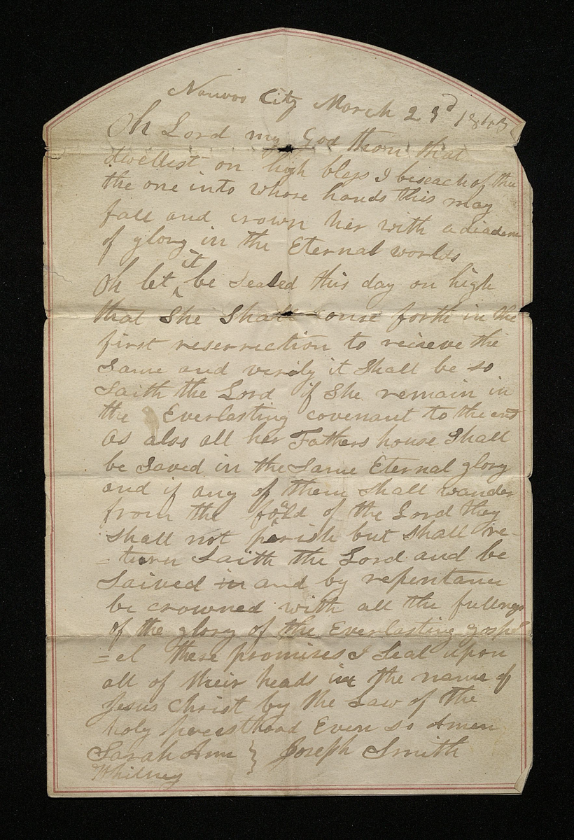 Ocho meses después de ser sellada a Sarah Ann Whitney, José Smith escribió de su puño y letra una bendición del sacerdocio (fig. 4) para su joven esposa plural, la cual aseguraba “bendiciones para ella y su familia” condicionadas a su fidelidad. “De los varios documentos que prometen bendiciones a los miembros de la familia Whitney,” señalan los editores de los Joseph Smith Papers, “la bendición aquí presentada es el único documento dirigido únicamente a Sarah Ann.” El documento autógrafo del Profeta, fechado el 23 de marzo de 1843, dice lo siguiente: