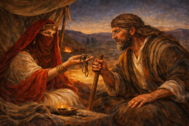 Judá promete a Tamar un becerro de su rebaño como pago. Tamar, mostrando gran presencia de ánimo, exige su bastón, su sello y su cordón hasta entonces. La importancia de esto a menudo se pierde para los lectores modernos. Judá está entregando el equivalente del antiguo Cercano Oriente a una billetera con licencia de conducir y tarjetas de crédito: una identificación que más tarde permitirá a Tamar demostrar su inocencia. En Mesopotamia, la pérdida del sello de una persona resultaba en la anulación de todos los acuerdos legales. El hecho de que Judá acceda a entregar estos objetos, a pesar de los posibles problemas, demuestra aún más un serio (aunque aparentemente temporal) lapsus de control sobre su apetito físico.