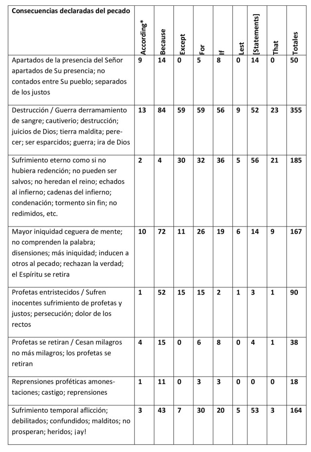 Tabla 4. Consecuencias declaradas del pecado con sus respectivas declaraciones condicionales
