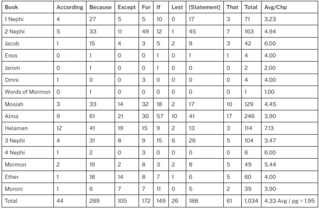 Usando el criterio anterior, el Libro de Mormón revela 1,034 declaraciones condicionales (con un promedio de 1.95 por página) que designan explícitamente un resultado de alguna forma de maldad. Con mayor frecuencia, el texto usa una palabra condicional para vincular la causa con el efecto (si, a causa de, por tanto, etc.). Para facilitar el informe, este artículo agrupa los pasajes según términos condicionales semejantes (mostrados en la tabla 1 a continuación) e incluye una categoría para aquellas declaraciones concisas sin término condicional.