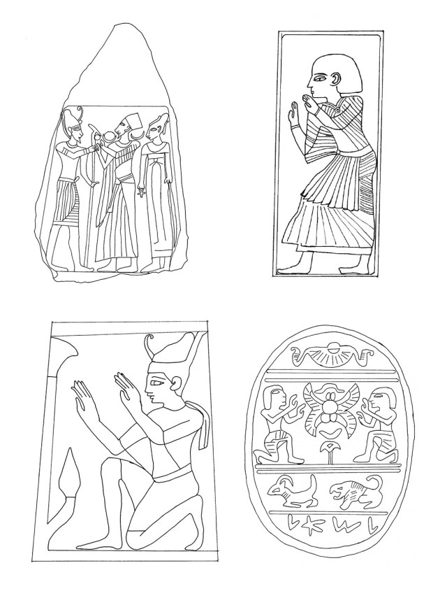 Ejemplos adicionales de este gesto pueden encontrarse en representaciones egipcias de pueblos semitas dirigiéndose al faraón. Una pintura de la tumba de Menkheperresonb en Tebas (ca. 1450 a. C.), por ejemplo, muestra a un grupo de no egipcios (en su mayoría semitas del Levante) acercándose al faraón con regalos, mientras al mismo tiempo le suplican por “el aliento de la vida” (figura 5). El primero se postra, mientras que el segundo se arrodilla y levanta ambas manos en el gesto de oración, y los dos siguientes se acercan con ofrendas de un niño y un recipiente para beber en forma de cabeza de animal.
