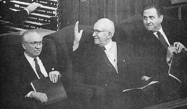 El 10 de noviembre de 1985. Ezra Taft Benson es ordenado decimotercer Presidente de la Iglesia, con Gordon B. Hinckley y Thomas S. Monson como consejeros.